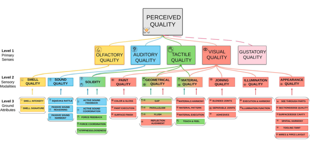 The PQF reflects an attribute-focused engineering viewpoint shaped by studies in the automotive industry, where products are highly complex. Within this framework, engineers categorize Perceived Quality attributes according to human sensory systems: